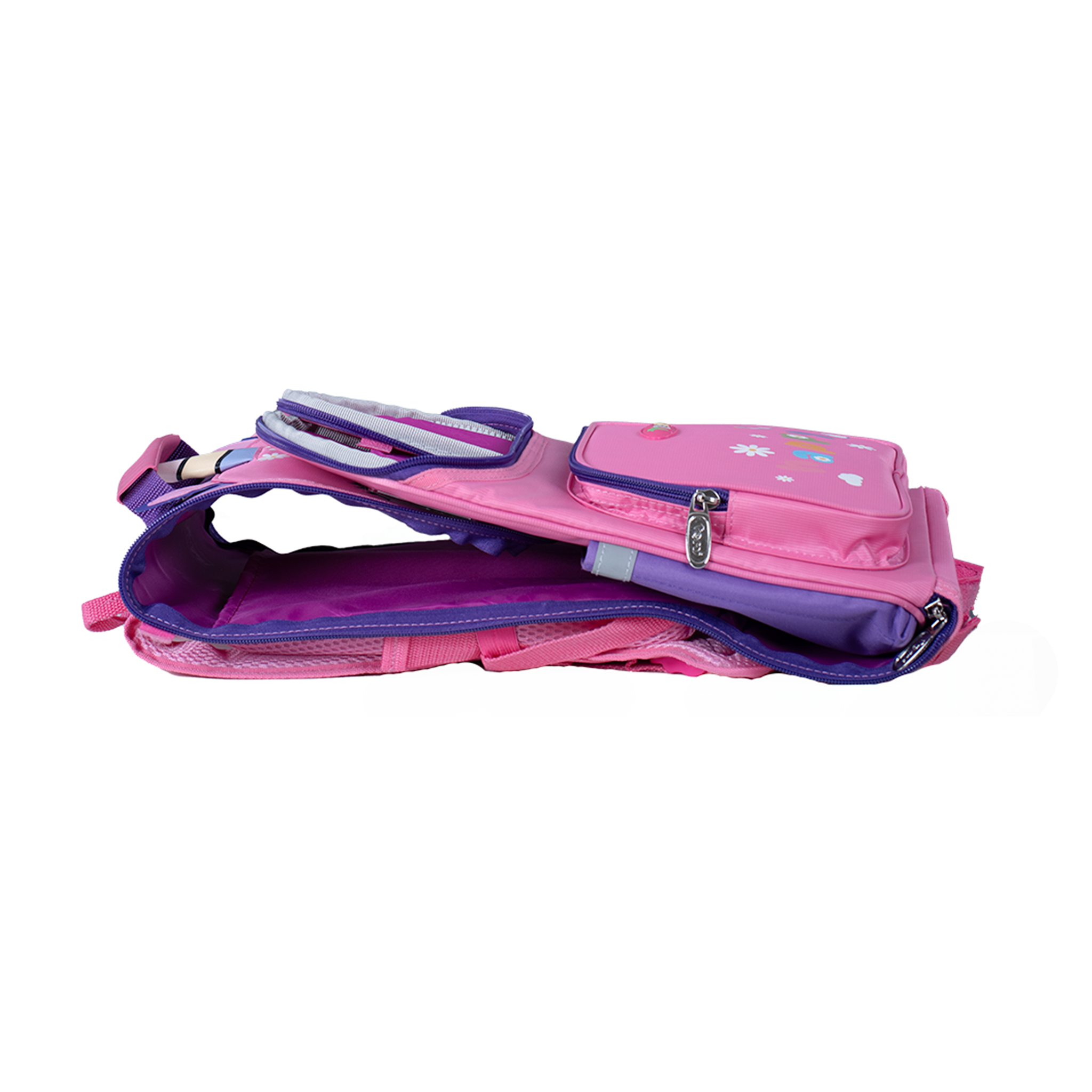 - Ngăn chứa của balo được thiết kế tiện lợi với 2 ngăn chính, 1 ngăn đựng viết, 2 ngăn phụ, và 2 ngăn đựng nước bên hông.